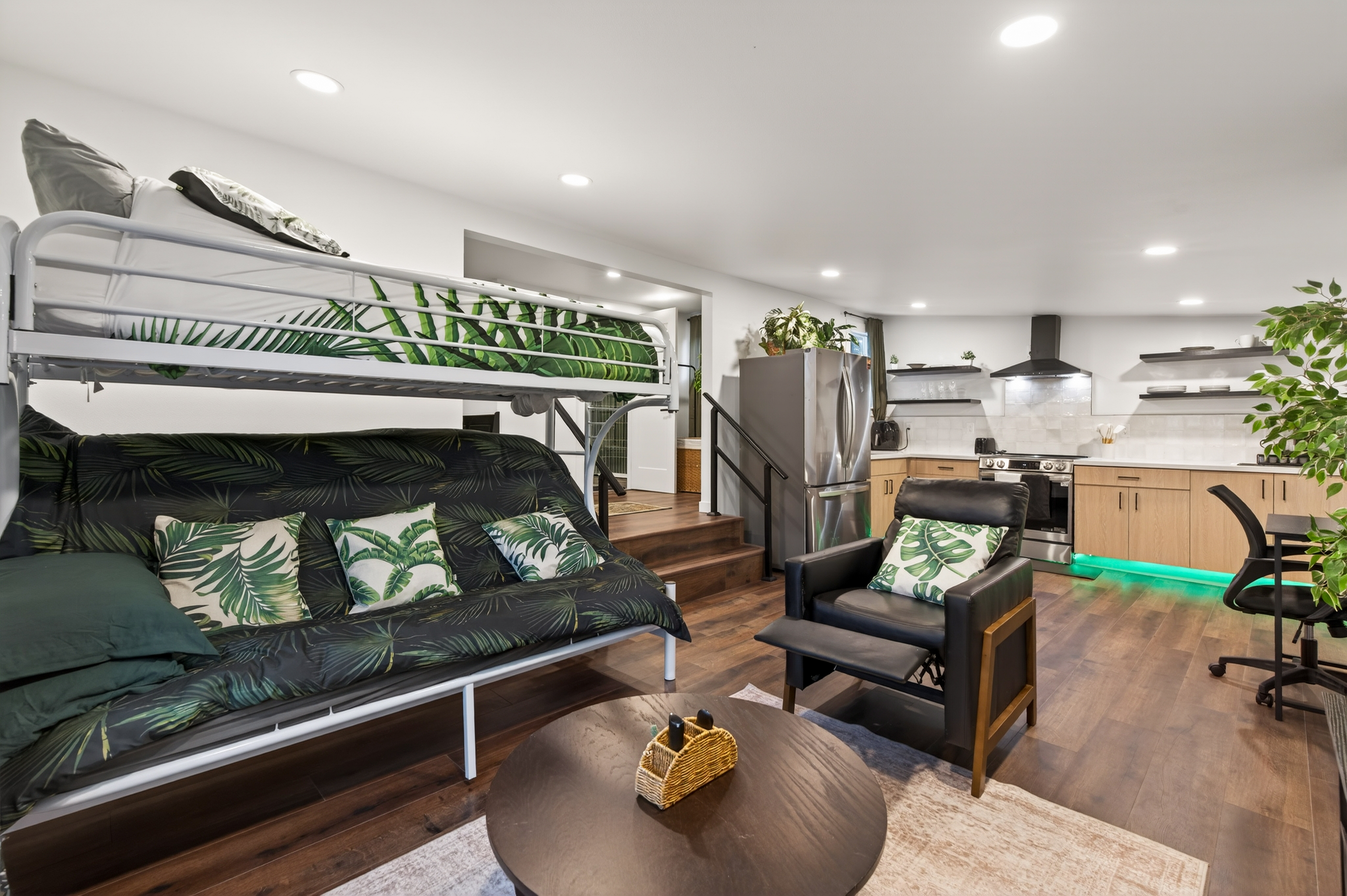 🌿 Welcome to Emerald City Jungle Escape 🌿 A stylish jungle-inspired studio retreat just minutes from Downtown Seattle. This newly updated space features a true rainfall shower, chef’s kitchen, bold green accents, and cozy modern lighting. Perfect for couples or small groups, the studio offers two beds, fast WiFi, and a comfortable layout designed for relaxing stays. Immersive design, modern comfort, and unbeatable location.
