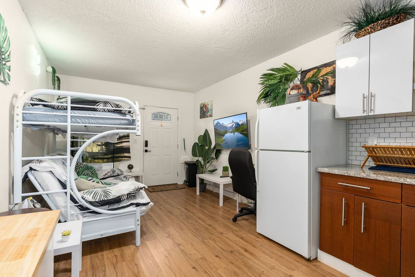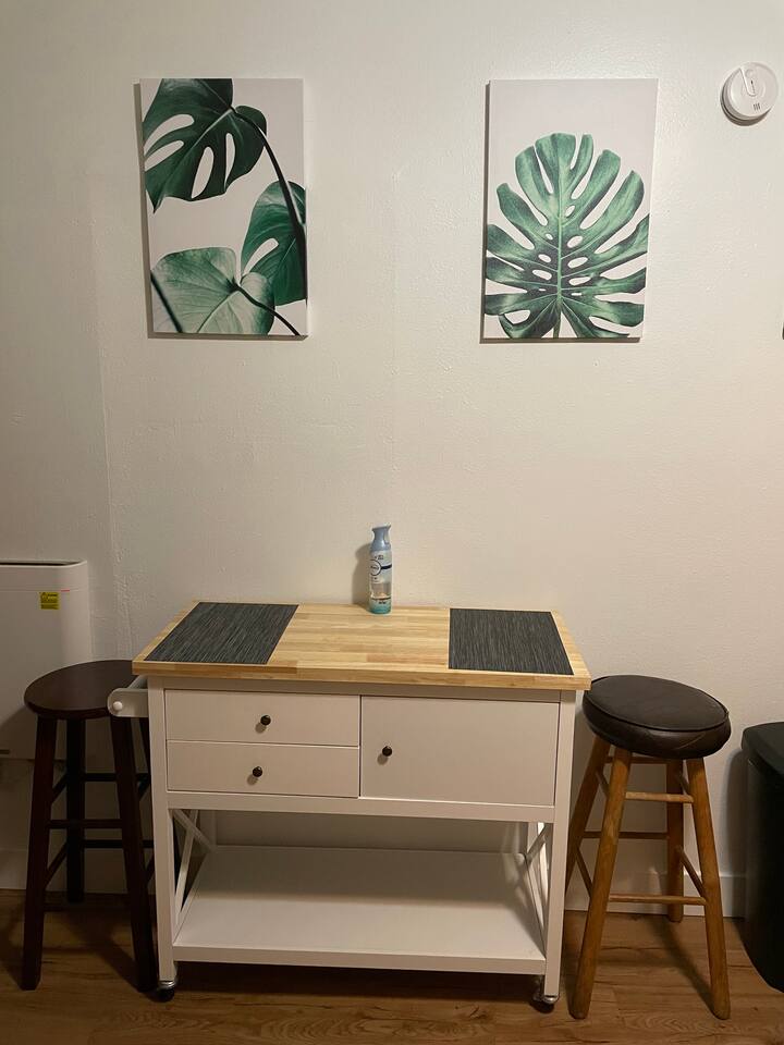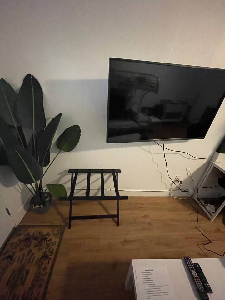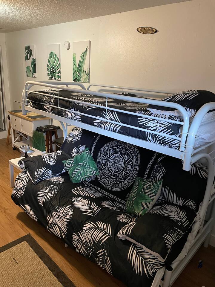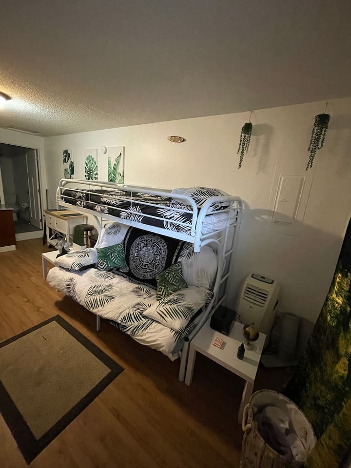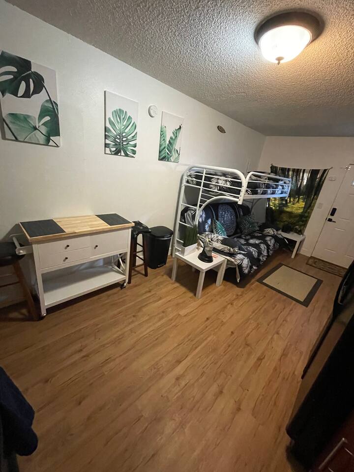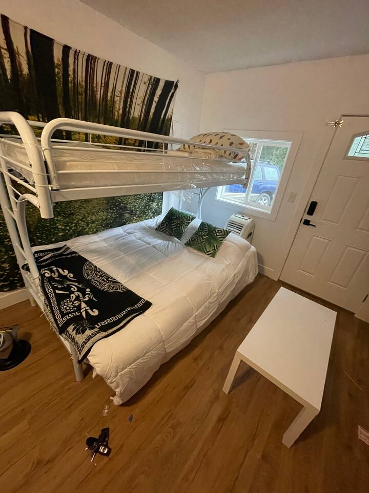 The space will provide one queen bed and one full twin bed. It will have 50in mounted TV , fire stick, comfortable quite desk area to work. Full kitchen to cook, nice bright clean bathroom. The entire place is yours. No shared space. O3 Air purification deodorizer system